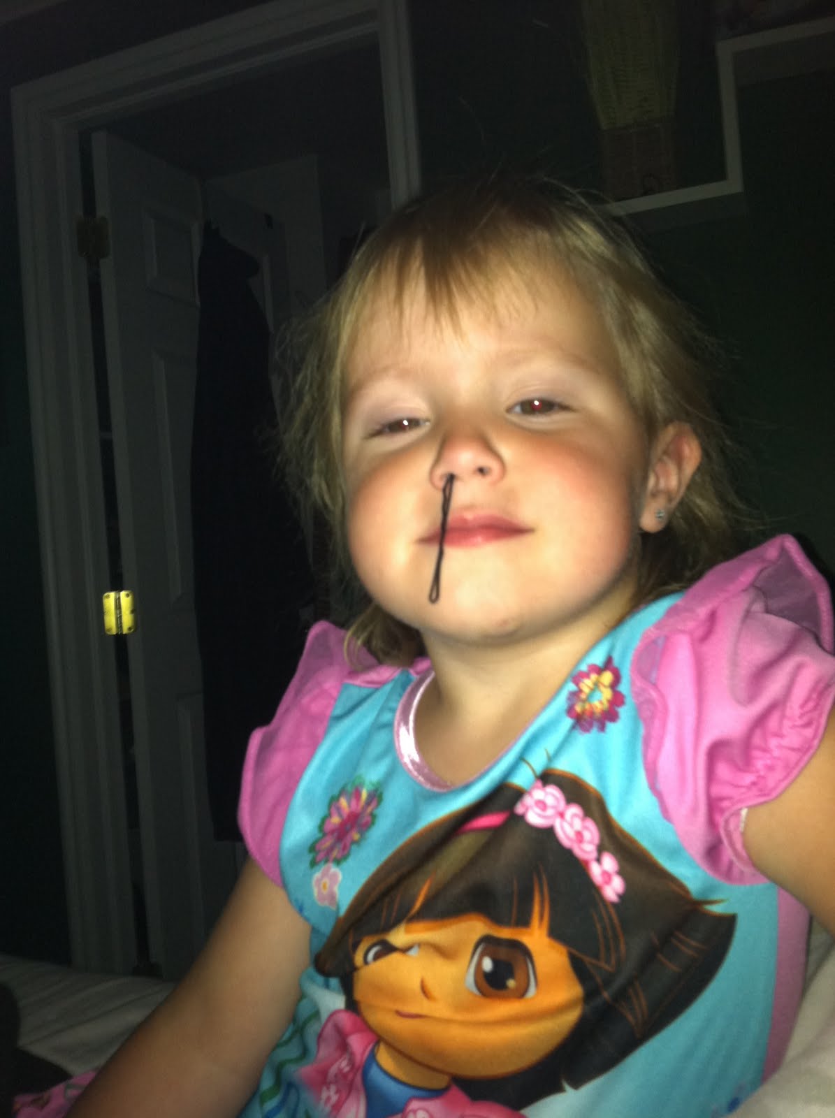 Marlee said hey mom take a picture of me, it was so dark in the room that I couldn't see her, but once the flash went off I realized she had thought it was super cool to clip a bobby pin to her nose.