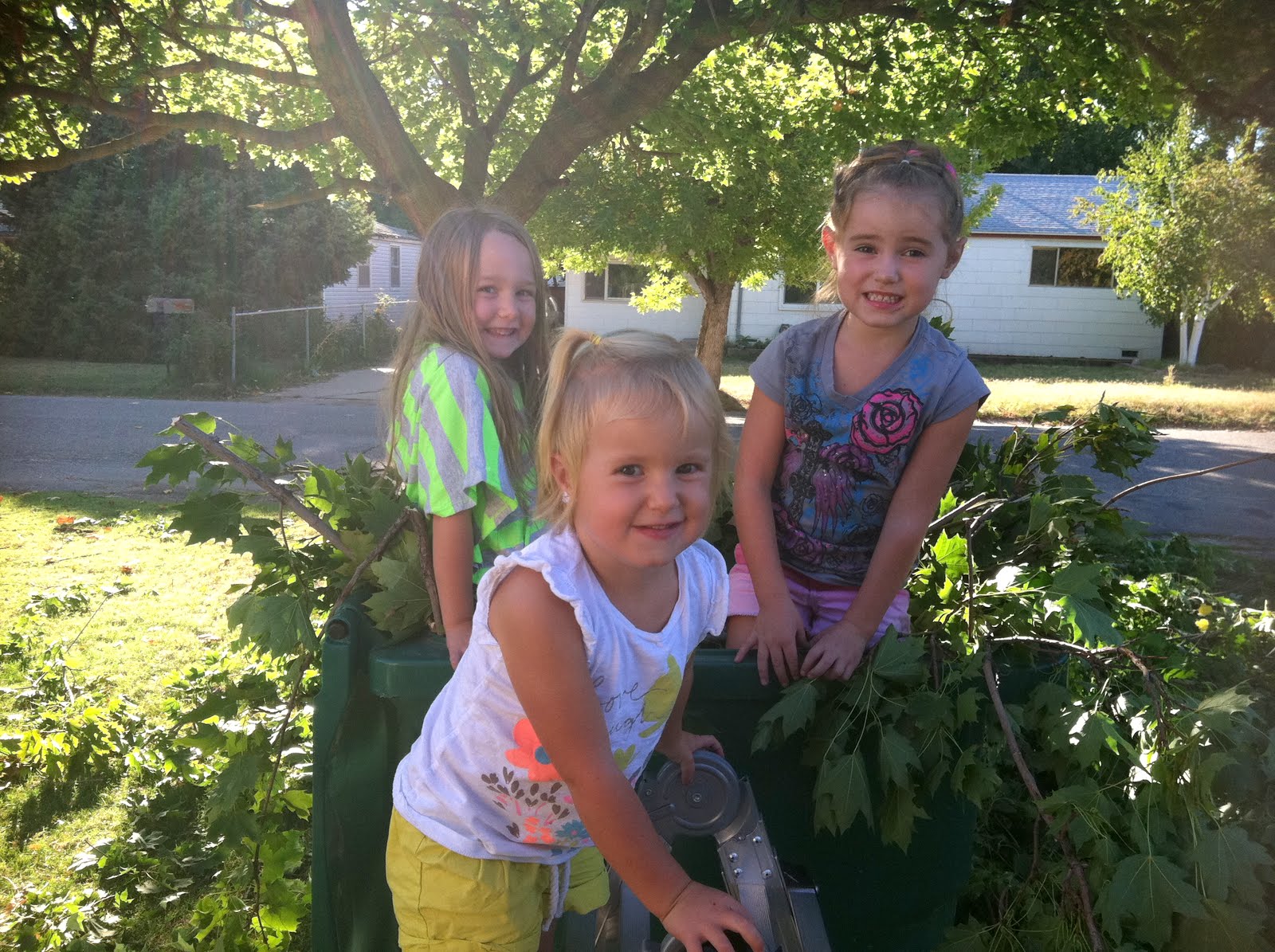 I trimmed the tree back in our front yard.  Oh boy was this a job that was more than I thought it would be.  I was cutting this huge tree in my yard with 10 dollar clippers from walmart and lets just say I couldn't lift my arms the next day.  The kids all helped along with Emily our neighbor friend stuffing the branches in the garbage.